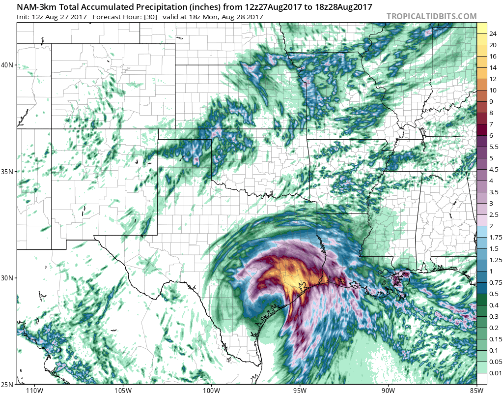 Going back through some saved graphics and I found these HRRR precipitation forecast. I began truly sinking in that SE Texas would be in serious trouble from flooding very heavy rainfall over the next 18 hours and beyond.