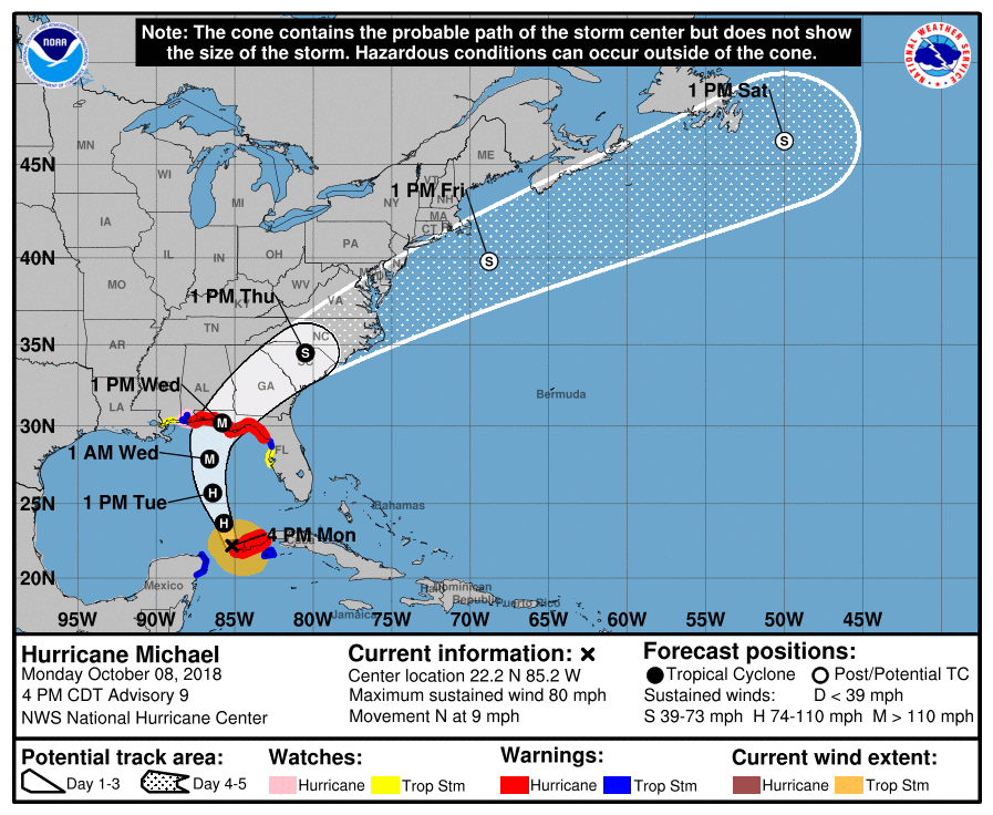 Hurricane Michael still expected to be a Major Category 3 Cyclone at Landfall and Hurricane Warnings as well as Storm Surge Warnings have been hoisted with the latest full package Advisory...