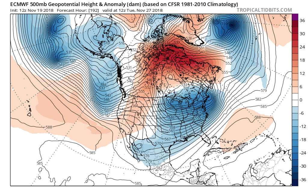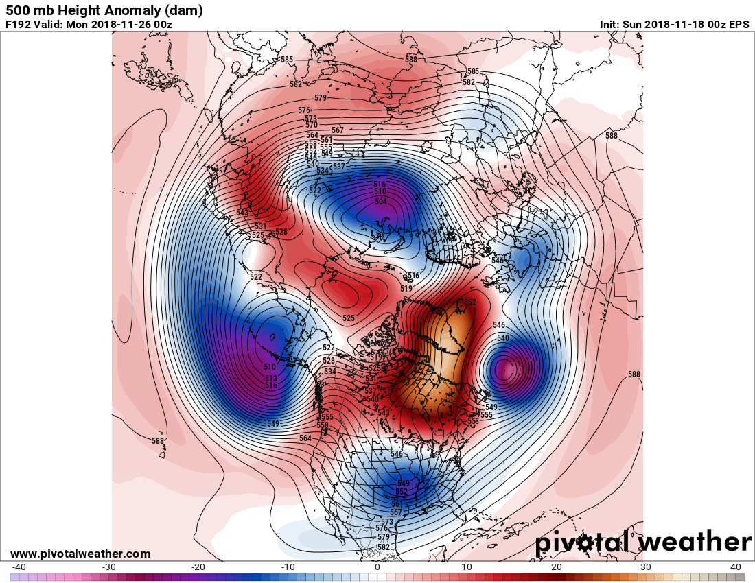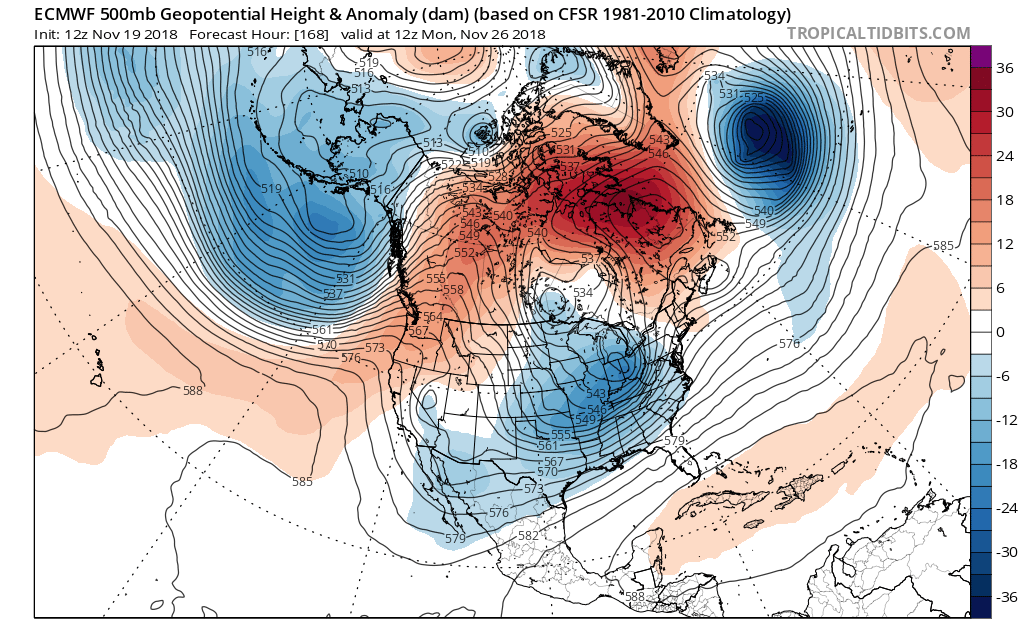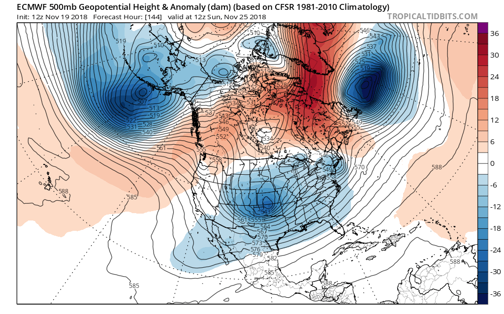The overnight ensembles are trending toward the possibility of a strong storm signal just after Thanksgiving. The 00Z ECMWF EPS suggests a deep trough over the Central/Eastern United States and a very impressive Blocking pattern over the higher latitudes of Greenland back into Eastern Canada. There are also indications that a surface low may ride out of Mexico into Texas sending a rather strong cold front across our Region. While it is too soon to know what the sensible weather may bring, I would watch in the Day 7 to 10 Range for changes brewing. The zonal flow we will have during the Thanksgiving Holiday period could change to a colder and active period as November ends a December begins.