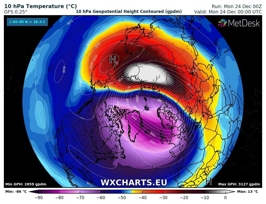 Those winds are associated with a Sudden Stratospheric Warming (SSW) event that could lead to colder temperatures for part of Europe and the Eastern United States depending on where it sets up and how strong it is. The GEFS is coming in a little more aggressive that the west to east flow we normally see could reverse direction some by the beginning of the New Year. If that happens it could open the door for colder air.