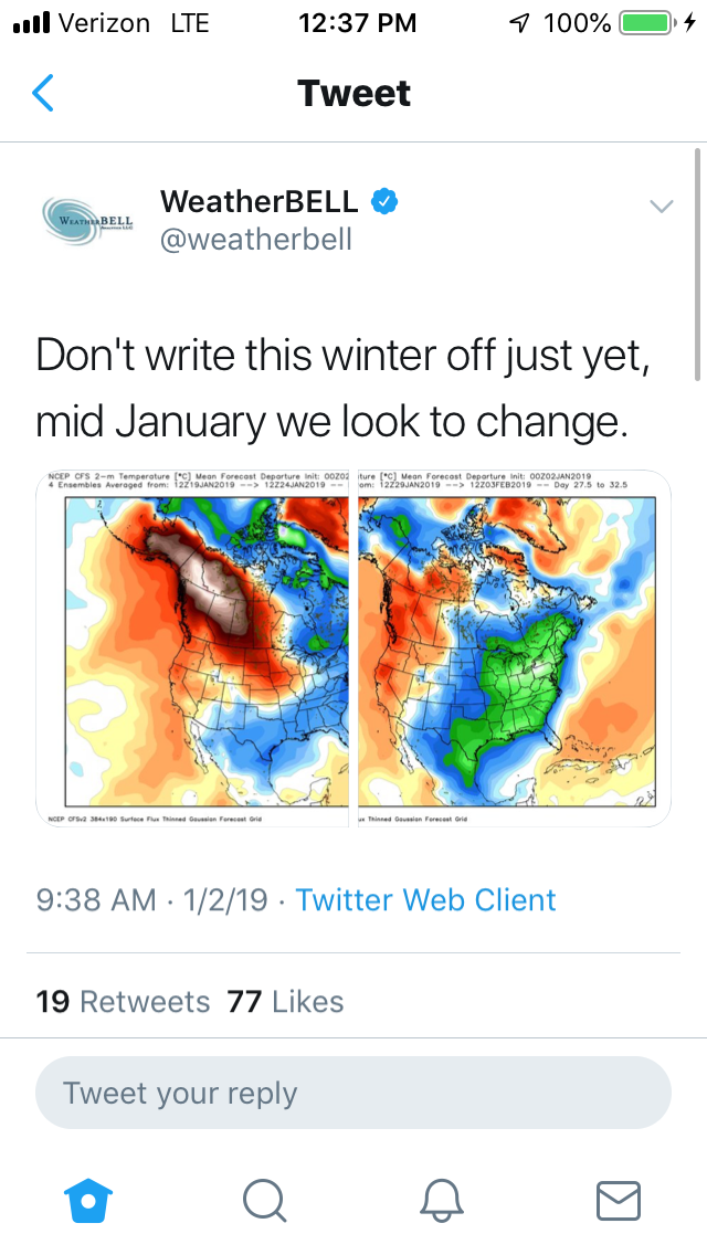 WeatherBell agrees with you!srainhoutx wrote: ↑Wed Jan 02, 2019 8:19 am Before the heavy rainfall event begins, I thought I would share something the very long range GFS is suggesting around mid January. We have spent some time talking about the Sudden Stratospheric Warming Event underway at this time. While I typically would not post a 384 hour chart of the GFS, is does help to show how the SSW Events may impact things going out in time. Currently the Polar Vortex is being attacked at several levels of the Atmosphere. Roll forward to mid month, the GFS suggest a split of the Polar Vortex into 2 big vortices and one minor vort. As the Artic warms due to top down warming to the Troposphere where we live and over the Artic Circle, cold air spills South across the Northern Hemisphere toward the lower latitudes. Baby steps toward a potential pattern change possibly.