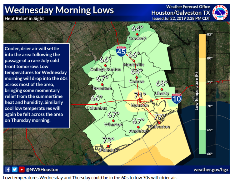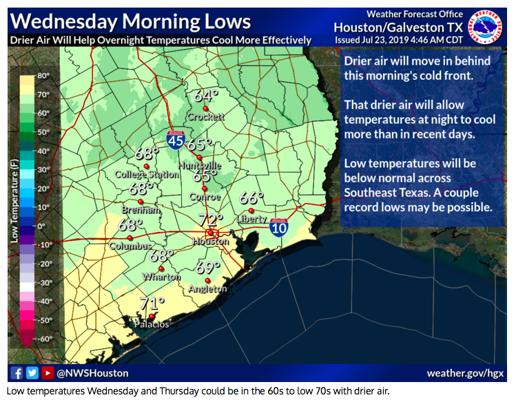 Though this won`t help cool things off terribly much as far as daytime highs, we`ll finally be able to cool more effectively overnight. Indeed, while ultimately most record lows will be safe, the Houston climate sites may get quite close for a night or two.