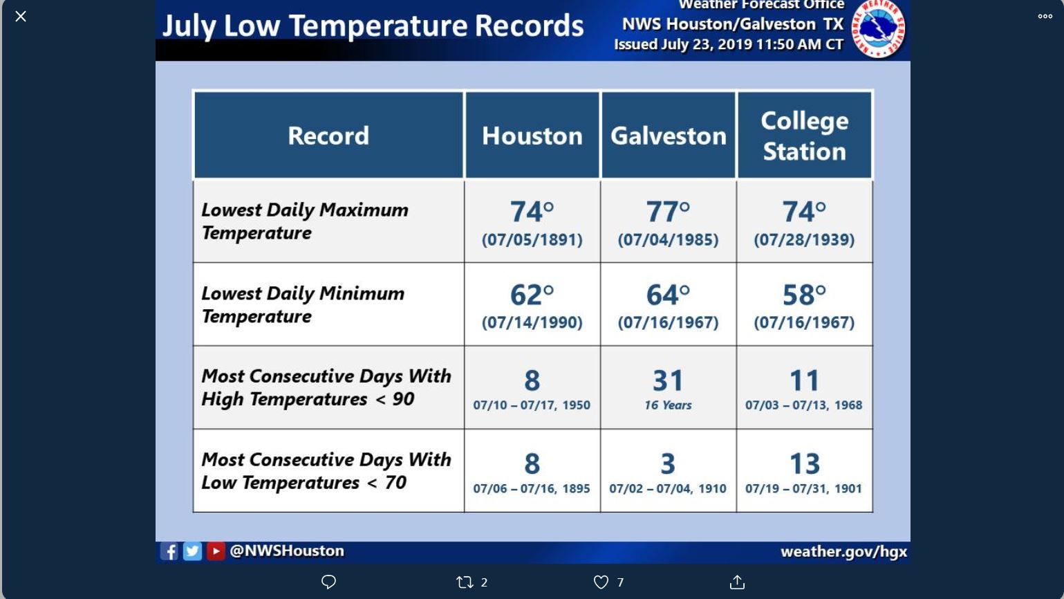 It rained like crazy until the first day of summer here. 1.70 inches since then. About 60% of normal. The good news is that we accumulated over a year's worth of precipitation from October to June 21 - Lakes and reservoirs are full. Water table is up. So the trees are in great shape for a change after years of stress. It has been a few degrees on average below normal.MontgomeryCoWx wrote: ↑Mon Jul 22, 2019 9:04 pmIt’s been a wetter than normal Summer.Cpv17 wrote: ↑Mon Jul 22, 2019 8:28 pm Why does it regularly rain so much during the summers in the southeast and here in Texas we have a difficult time getting rain?I’ve always wondered that. Can’t really complain too much this summer though. We haven’t even reached the upper 90’s yet here in Wharton County.
