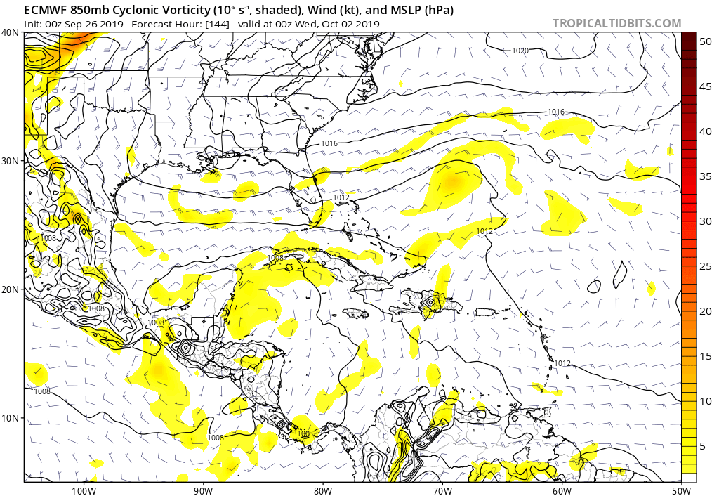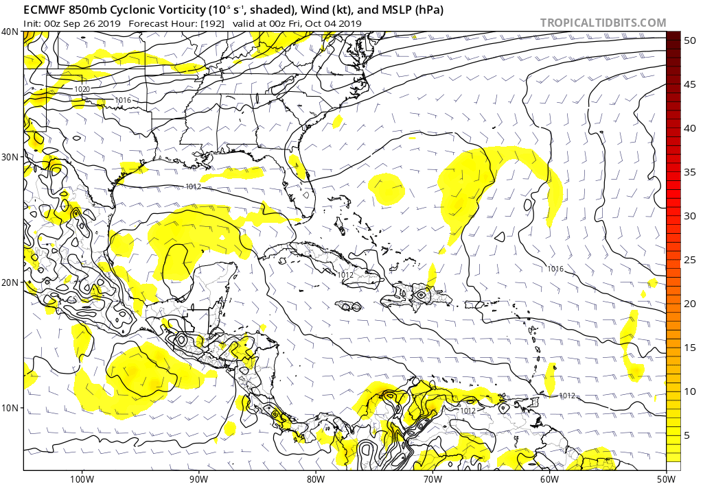 It kinda looks to me that the 0Z Euro brings the "remnants" of Karen into the mid Texas coast on the morning of 10/5.srainhoutx wrote: ↑Thu Sep 26, 2019 7:31 am I do see the ECMWF/GFS are suggesting a robust monsoonal/Central America gyre developing as October begins. Conditions in the Western Caribbean and portions of the Gulf could be rather favorable for tropical development as a new month begins. The Eastern Pacific is another favorable location, particularly near the Gulf of Tehuantepec. We need a good strong cold front to shut down any tropical weather worries along the Texas/Louisiana Gulf Coast.