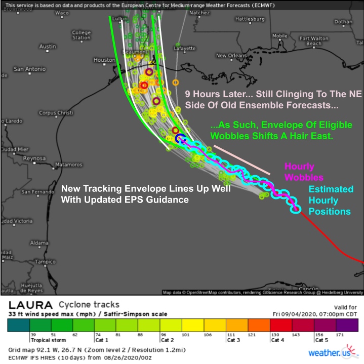 weatherguy425 wrote: ↑Wed Aug 26, 2020 11:52 amTechnically, the turn has begun. WNW to NW between 1 & 4AM advisories. Still, some uncertainty with the very specifics as there always tends to be - like you mentioned.DoctorMu wrote: ↑Wed Aug 26, 2020 11:48 amThanks. Laura's CoC vector has not changed on average in the last 24 hours. She was on the right side of her projected path 24 hours ago, and now is in the middle. I'm not saying that Laura won't start turning to the NNW and eventually N (because she'll reach the western edge of the ridge), but empirically she has not yet.weatherguy425 wrote: ↑Wed Aug 26, 2020 11:44 am