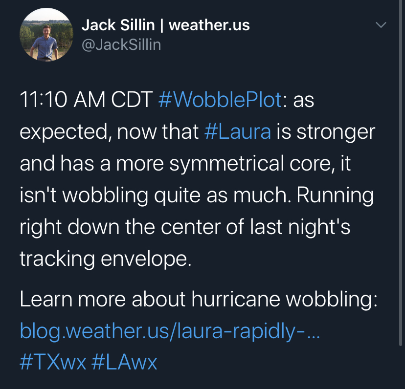 Initial chance occurred between the 1 & 4 AM CDT advisories. These turns are gradual. We shouldn’t dismiss it. I’m just saying nothing out of the TX, LA border range right now.weatherguy425 wrote: ↑Wed Aug 26, 2020 11:44 amIt certainly can. 20 miles is pretty substantial. No sign of that yet. Here is a wonderful reference - a great follow on Twitter, btw.Texashawk wrote: ↑Wed Aug 26, 2020 11:39 amBut at this point, with the size she’s attaining, even a 20 mile wobble = 10-20 higher MPH winds here potentially, right?weatherguy425 wrote: ↑Wed Aug 26, 2020 11:36 am