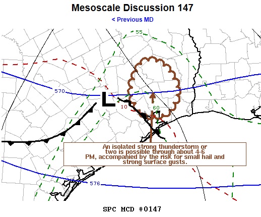 The SPC Day 1 Convective Outlook released 50 minutes ago has a localized Marginal Risk area across the Houston-Galveston areas this afternoon.