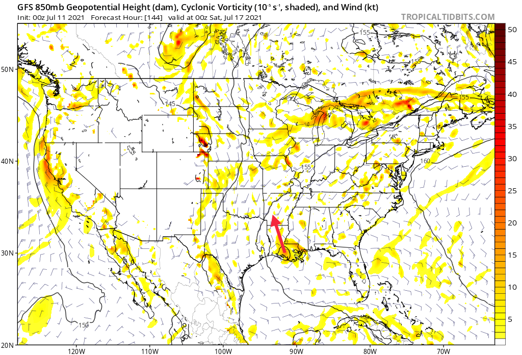 The gfs has been consistent in showing an easterly wave rolling in the La/Tx region Friday and this coming weekend in varying strengths, especially noted in the 850mb midlevels vort depiction. It is tough to track at 12z but still there. It only increases the seabreeze action really.