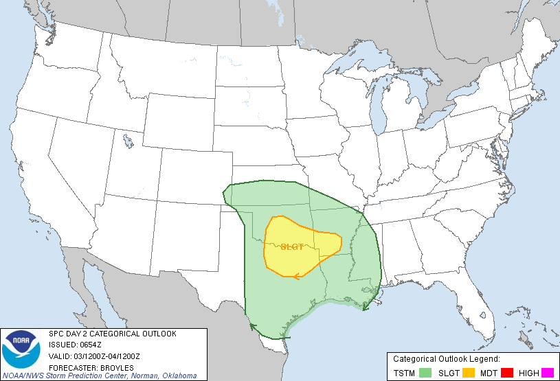 Upper level storm system currently over the SW US will eject into the plains forcing a cold front southward through TX and off the coast Saturday. Air mass ahead of this front will be moist and unstable by Friday afternoon with lift increasing, expect to see scattered showers and thunderstorms developing in the heat of the afternoon. More organized thunderstorms (some strong) will move across the region from NW to SE Friday night and Saturday morning with the cold front. Not overly impressed with the dynamics nor the instability with this event, so while thunderstorms are possible if not likely, severe weather is not expected. SPC Day 2 slight risk outlook (see below) does near our northern row of counties north of Huntsville for Friday afternoon and night, but general reasoning is that any severe threat will be isolated. Rainfall amounts of .5 to 1.0 inch will be possible across much of the region, but with PWS pushing toward 1.5 inches cannot rule out a few isolated higher totals nearing 3-4 inches.