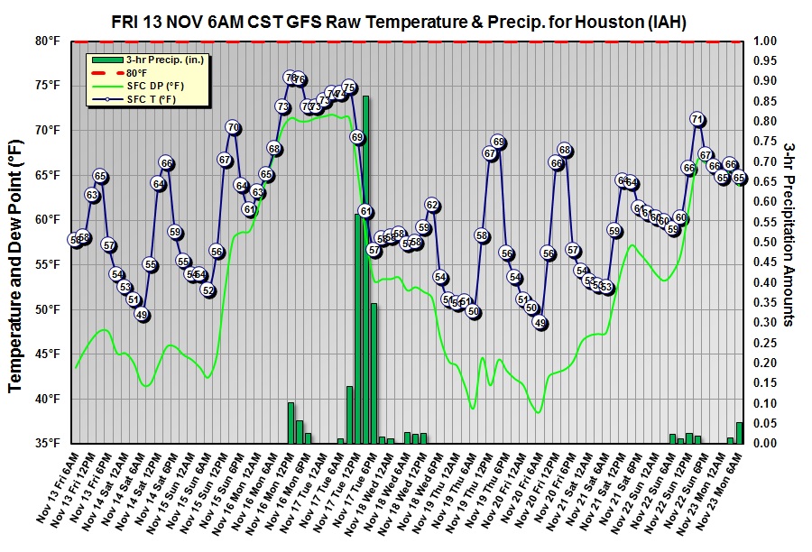 The overnight guidance continues to advertise active weather days Monday to our N and W into Tuesday when portions of Central, East, NE and SE Texas into Western Louisiana are under the gun with the primary severe weather threat being Tornadoes, damaging winds and isolated heavy rainfall. A slow moving squall line should be advancing East early Tuesday morning from Central Texas possibly reaching Metro Houston during peak heating. Any discrete rotating super cells developing ahead of the main squall line will be capable of rotating updrafts from veering wind profiles as a deepening surface low bombs out near Western Kansas. 1 to 3 inches of heavy rainfall is possible as the squall line advance East with isolated higher amounts of 4 to 5 inches of rain falling in short order in the more intense thunderstorms. Stay weather wise Monday into Tuesday night folks. This strong storm system appears to be a harbinger of a pattern change that will continue into the busy Thanksgiving Holiday travel period.