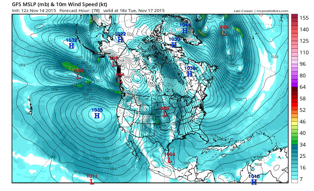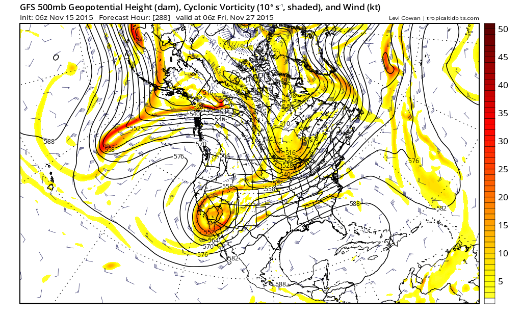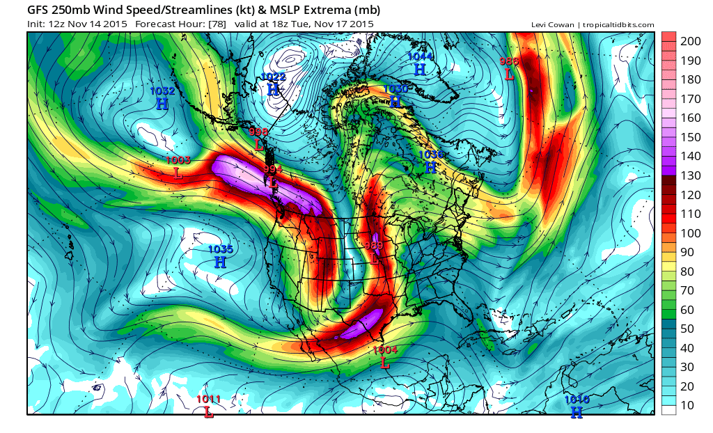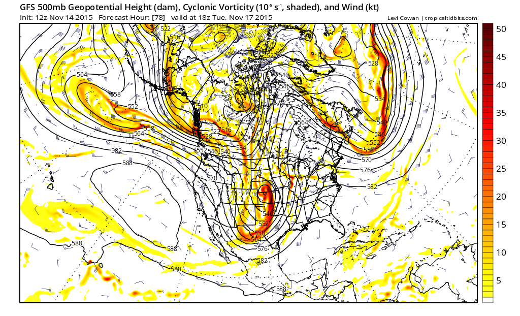 Upper level system will drop down the US west coast and into the SW US on Sunday and really begin to intensify. This intense deep longwave trough will force strong surface pressure falls over NW TX Sunday night into Monday with an impressive mid-November cyclone developing over the central and southern plains. Strong low level jet of 40-60kts develops over coastal TX Monday transporting significant deep layer moisture northward. Upper jet stream is overhead and expect thunderstorms to erupt Monday afternoon in a very highly sheared air mass. Low level jet will be crossed with a powerful 90-120kt mid level jet stream over the area resulting in strong veering of the wind field with height and strong vertical shear. Forecasted low level shear parameters for late Monday into next Tuesday are impressive. Main question is the amount of instability in the warm sector over the region. Dewpoints likely to surge into the lower 70’s and with strong mid level cooling likely as the strong upper level trough tilts negative allowing the mid level cold pool to eject across the warm sector resulting in good instability. Parameters are certainly pointing toward a potentially significant severe weather episode…including tornadoes given all the wind energy…this is something that needs to be watched very closely over the coming days. Some of our worst tornado outbreaks in SE TX have been in the month of November and the worst was in November 1992 when multiple strong tornadoes including a F4 moved across Harris County. Parameters become even more favorable early Tuesday morning with a strong cold front slicing into a highly sheared and moderately unstable air mass. Upper jet goes into a strong split structure over SE TX allowing good lift of the pre-frontal air mass. A squall line with wind damage will be possible along with discrete supercells ahead of the line. If these supercells root near the surface they will likely become tornadic given the strongly sheared air mass.