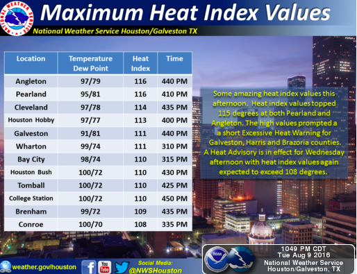 Still forecasting heat index values near 110 degrees tomorrow aftn