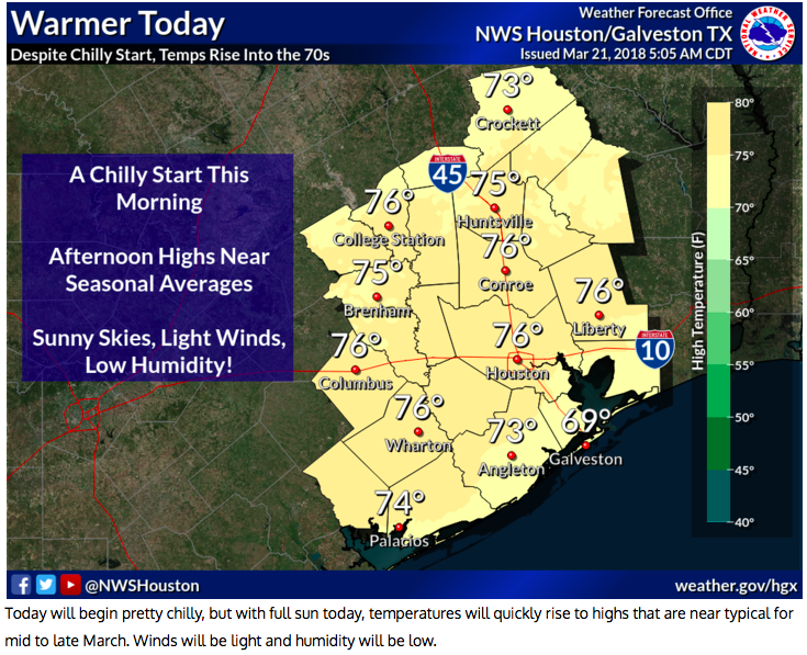 Perfect SE TX weather for the 1st day of Spring 2018. The Spring Equinox arrived at 11:15AM this morning. Blue skies, temps in the upper 60s & low 70s, humidity in the upper 20s & low 30s, and dew points in the upper 30s this evening……..the definition of Chamber of Commerce weather for it gets no better.