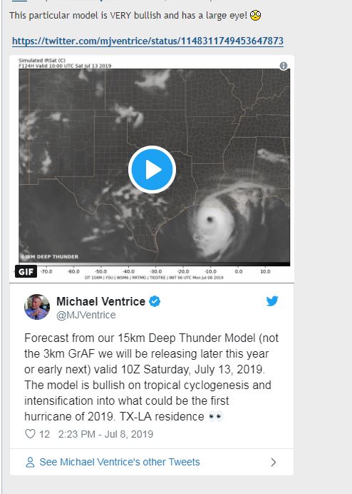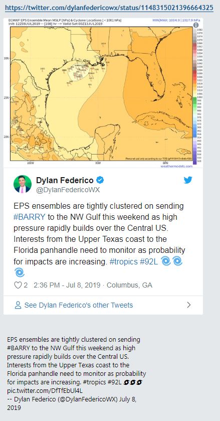 Update: 12z UKMET has a Category 1 hurricane or stronger tropical storm at Morgan City LA on Saturday evening. Operational ECMWF shows a possible Barry west of Beaumont TX Saturday night. GFS ensemble mean suggests tropical depression Galveston Bay. GGEM members are not showing an organization of this threat.
