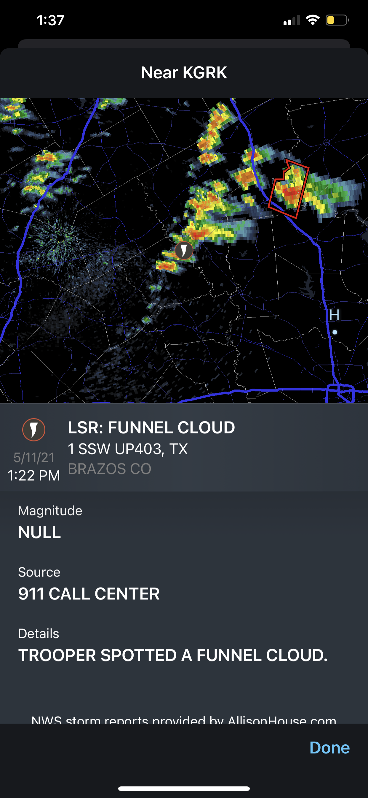 That should read 35 miles southWEST of College Station. Pretty nice wall cloud to the west. Light rain here.
