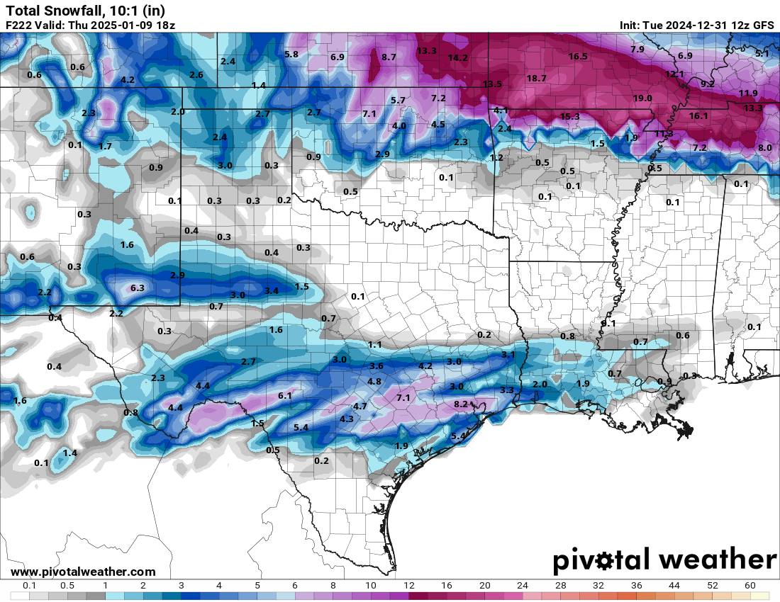 What day next week are we looking for this to possibly occurStratton20 wrote: ↑Tue Dec 31, 2024 11:52 am Cpv17 6-8 inches of snow for all of se texas on that run, on top of 1.5 inches of ice, yikess