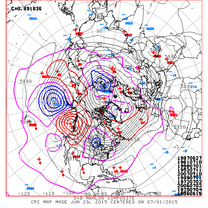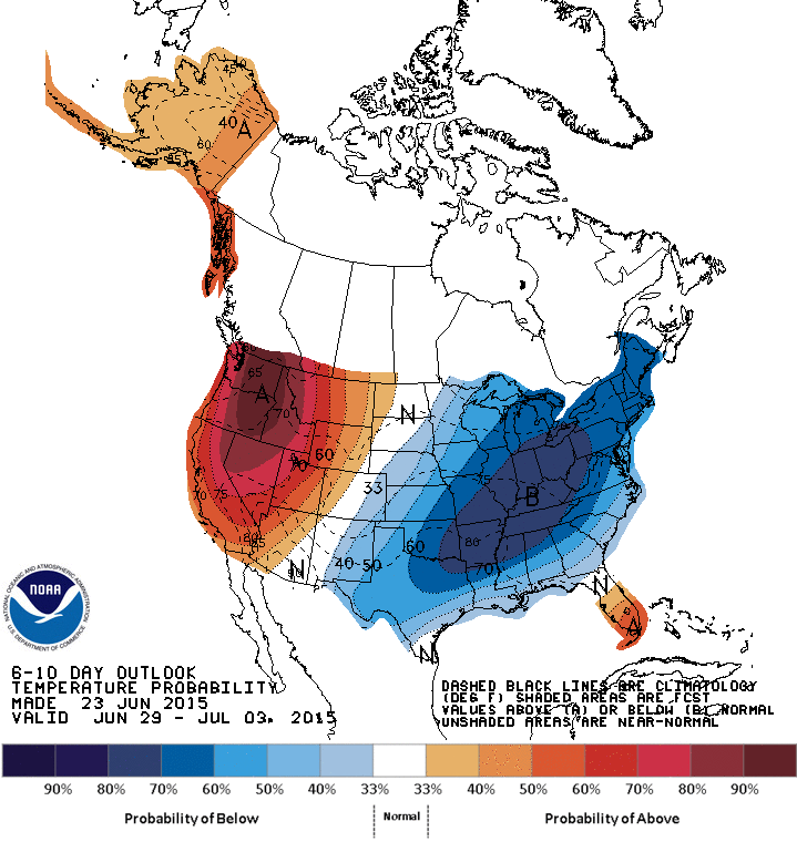 The afternoon Update from the Climate Prediction Center suggests we end June and begin July a bit cooler and perhaps with a bit of moisture heading toward the July 4th Holiday period.