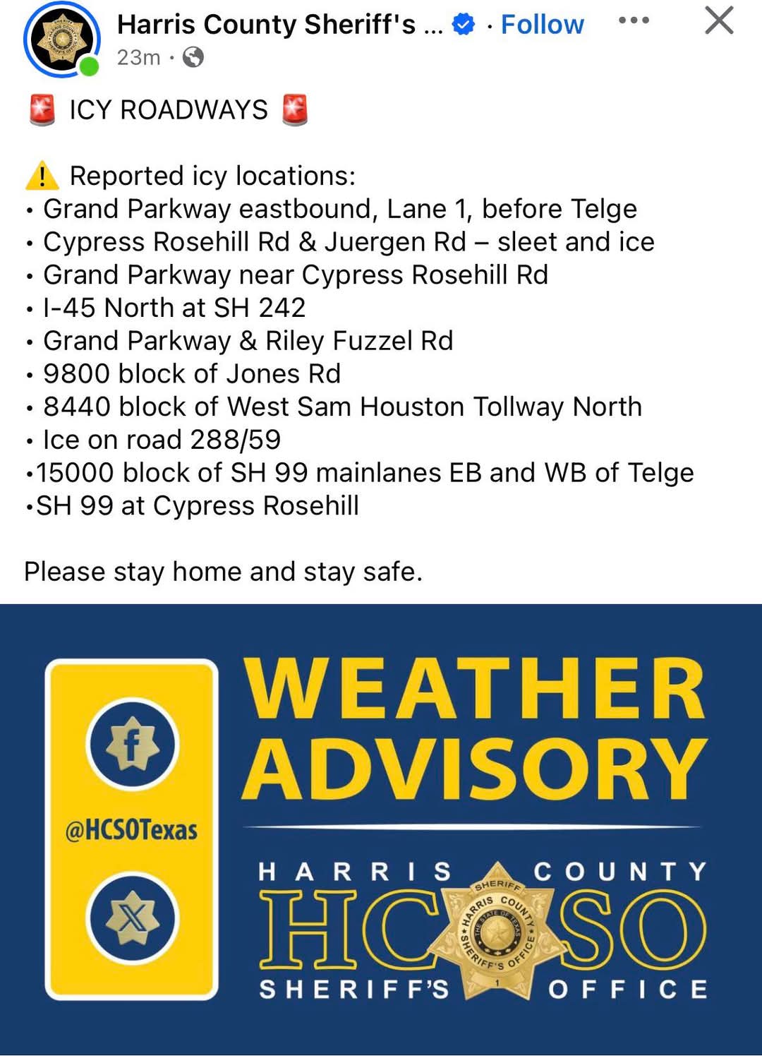 Ice is forming on bridge quickly in NW Harris County. Travel is strongly discouraged