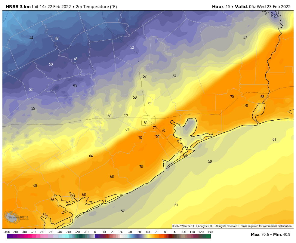 Folks. The front is already through CLL. Getting colder by the minute. Overperforming as expected...and I wouldn't not be surprised to see the front barrel to the coast well ahead of schedule.Andrew wrote: ↑Tue Feb 22, 2022 4:07 pm Pretty amazing how far off the global models were with the stalling of this front. Instead of being in the upper 70s / low 80s tomorrow, most locations will be 30-40 degrees colder with temps in the 40-50s during the late morning and struggling to get any warmer than that during the afternoon. The globals still say return flow will occur briefly on Thursday before the reinforcing cold front pushes everything through, but some of the mesoscale models indicate that won't happen and we stay on the cold side of things through the rest of the week.