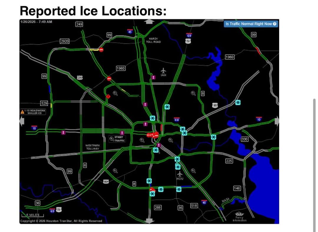 Ice sort of danced around the metro Houston area…warm bridge surfaces (34-36 degrees) and some warm rain processes and latent heat release (temperature of the actual rain drop was warm 35-40) likely the reason the metro area was spared.