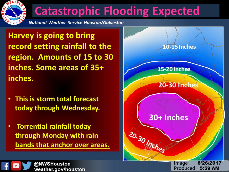 Here's a look at rainfall totals over the next 5 days based on the projected stalling and slowing in speed of #Harvey. #houwx #glswx #bcswx