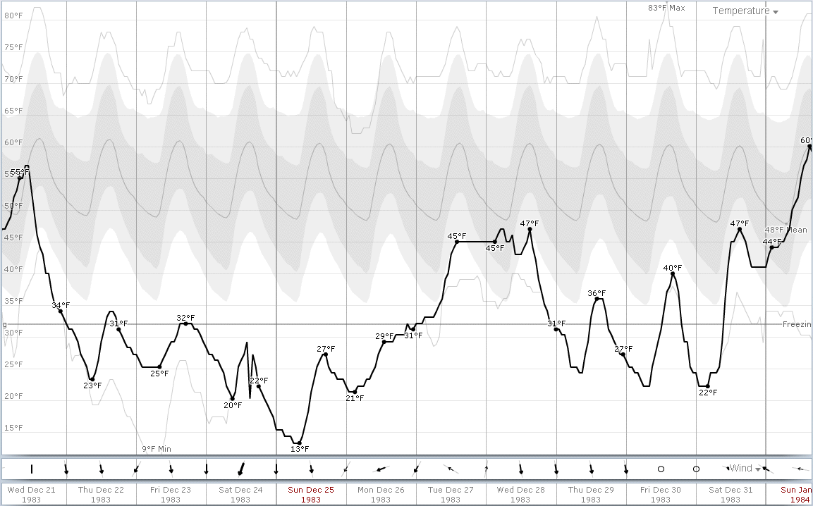 First, the 1983 Christmas Freeze. Note that the graphics below are from Hobby Airport. It was colder in central and north Houston. Look at the high of 28 on the 24th and a low of 13 on Christmas morning. High of 27 on Christmas. And there were a couple of other hard freezes later in December. Central and northern parts of Houston were below freezing from Wednesday evening (Dec 21) through Thursday morning (Dec. 27th).