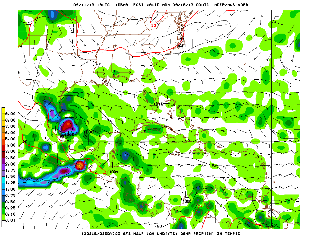 The intensity forecast will depend on how long the system remains over the warm waters (85-87 degrees). Upper level conditions are expected to be favorable and the terrain and curvature of the Bay of Campeche helps to spin tropical systems up sometimes rapidly when all else is favorable. The GFS shows a 983mb hurricane moving toward the MX coast between Tampico and Brownsville early next week and even the EURO has increased its intensity over the past few runs. One potential drawback with a very slow motion could be the upwelling of colder water from below the sea surface…which if 93L sat in the same place long enough could happen and prevent intensification and even induce weakening.
