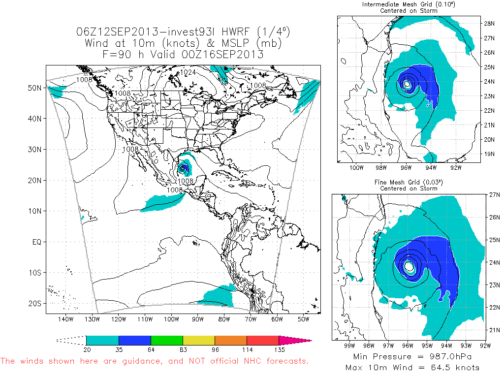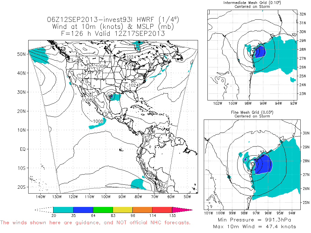 The 06Z HWRF Hurricane Guidance suggests we may see Hurricane Ingrid making landfall just N of Tampico and then sliding N to NE along the Texas Coast to near Seadrift/Aransas Pass as a tropical storm just inland along the Coastal Plain of South Texas.