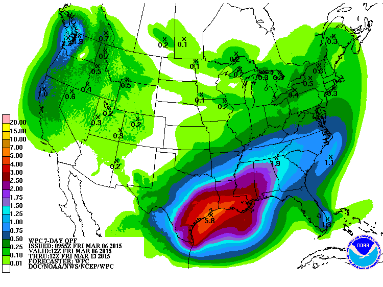 We are entering a very unsettled and unstable period regarding our sensible weather. The pesky upper trough appears to be stuck across Mexico, Texas and Louisiana for the foreseeable future. To add to the mix, a very strong MJO pulse is moving E across the Pacific. Abundant Eastern Pacific moisture with embedded disturbances riding S of the Polar jet to our North as well as a Coastal trough developing tends to spell a very wet and possibly unsettled pattern well into the mid March timeframe. Some locations could see at least 4 to 6 inches of rainfall with a potential of some higher rainfall totals where training elevated storms develop.