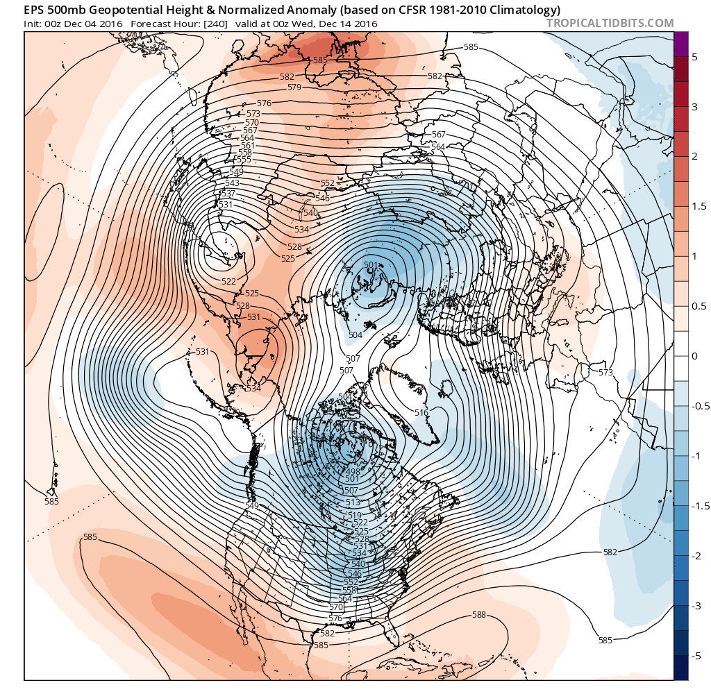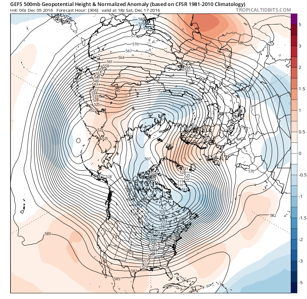 The longer range GEFS ensemble guidance continues to advertise well below normal temperatures may be possible beyond mid December. The Hemispheric Pattern driving all the continuing reloading of our source Region with very cold Arctic air is a very negative -WPO and negative -EPO with a tanking AO regime. Also following the contours of an anomalous Arctic Bering Sea/Eastern Alaska Ridge suggests a strong cross Polar flow continues into the 20th or so of December, if the longer range ensemble guidance is correct.