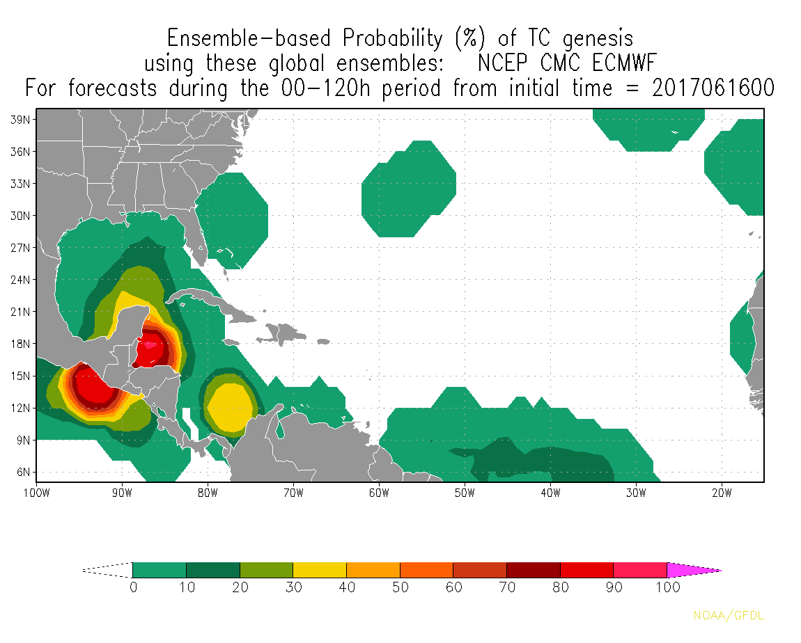 The overnight Ensemble Tropical Cyclone Genesis Probabilities did increase to near 100% near Belize and the Yucatan Peninsula in the NW Caribbean over the next 120 hours. You can see probabilities also increased near the Gulf of Tehuantepec in the Eastern Pacific which suggests the very broad nature of the monsoonal gyre.