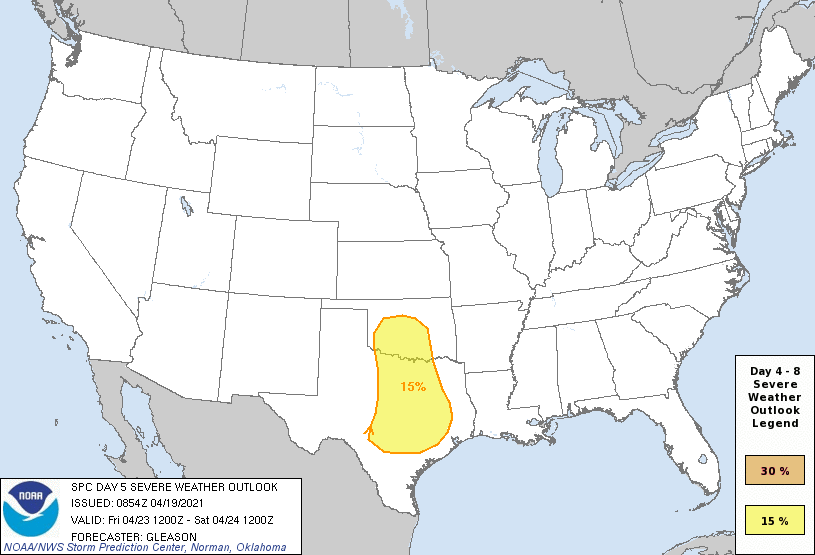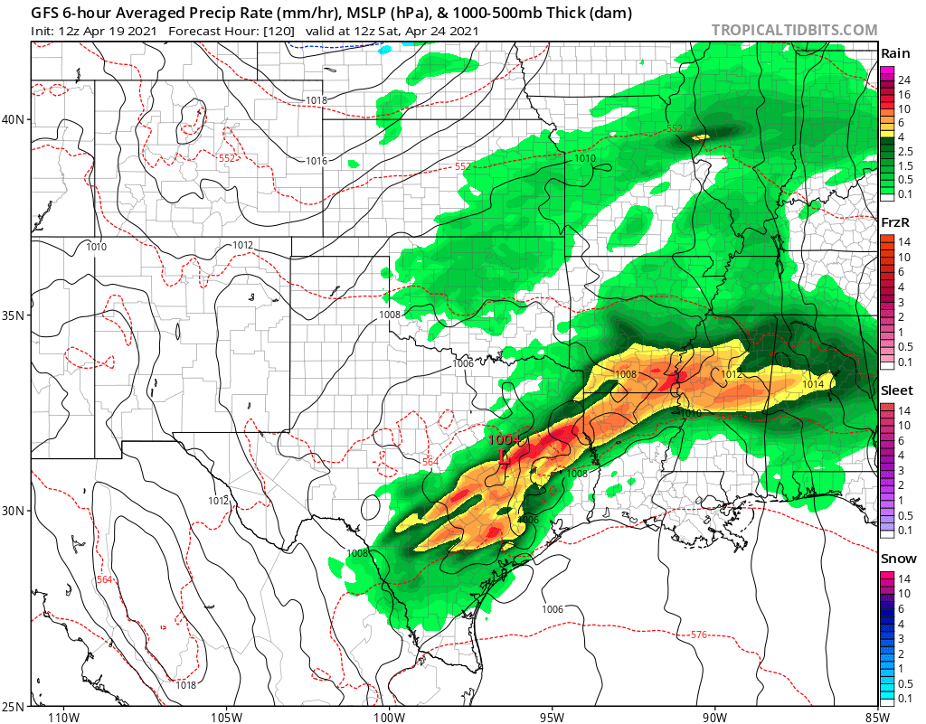 don wrote: Mon Apr 19, 2021 11:46 am Models are showing possibly multiple rounds of heavy rain and severe thunderstorms Friday and Saturday. As the frontal boundary briefly stalls which allows multiple disturbances to ride the front over the area.