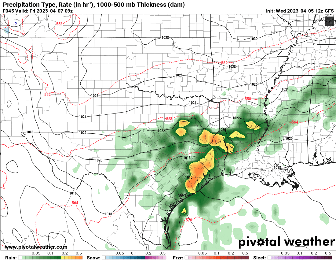 S of 59 and I-10 now looks like far less rain as the models flipped. I'm kind of amazed at this much rain on the cold side of a spring front without SJT support.