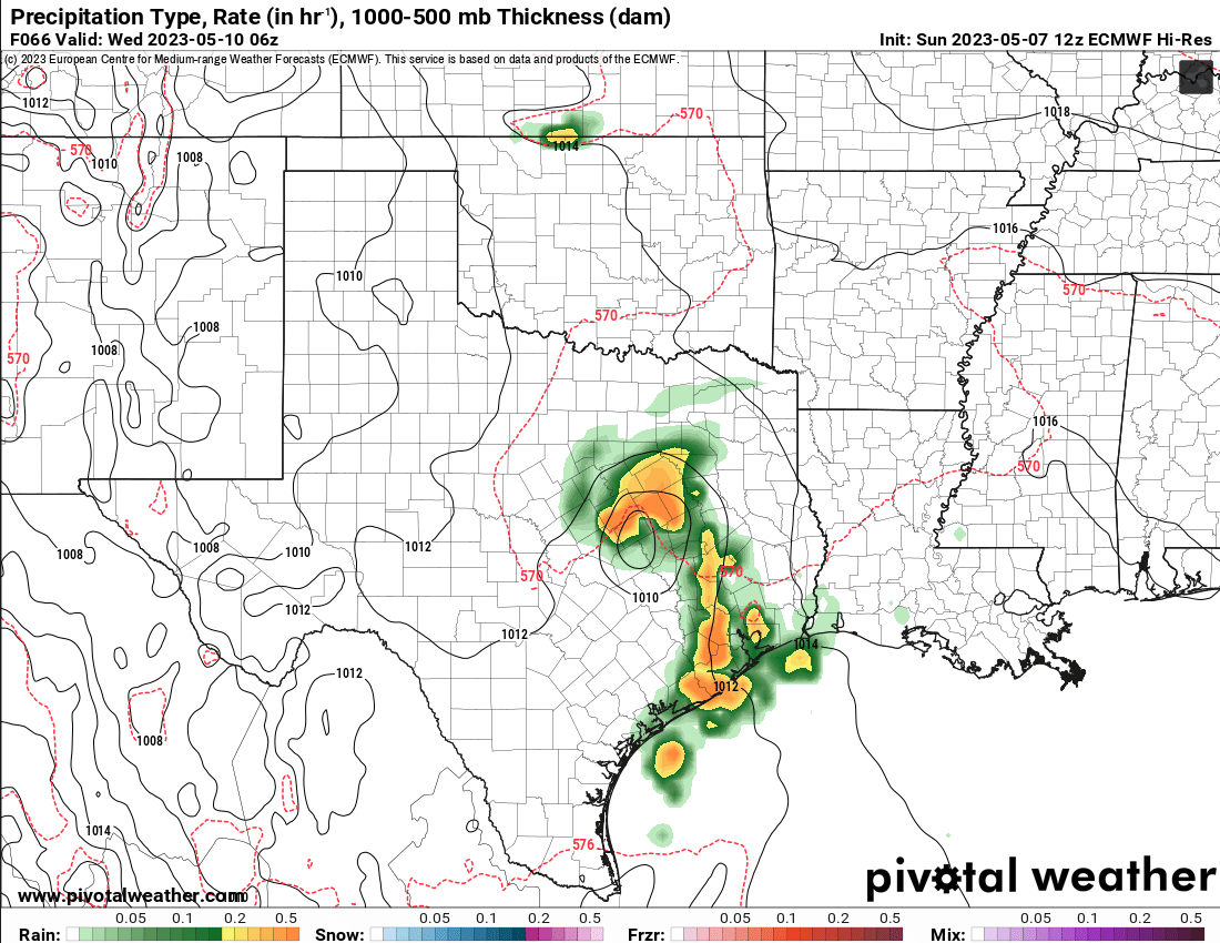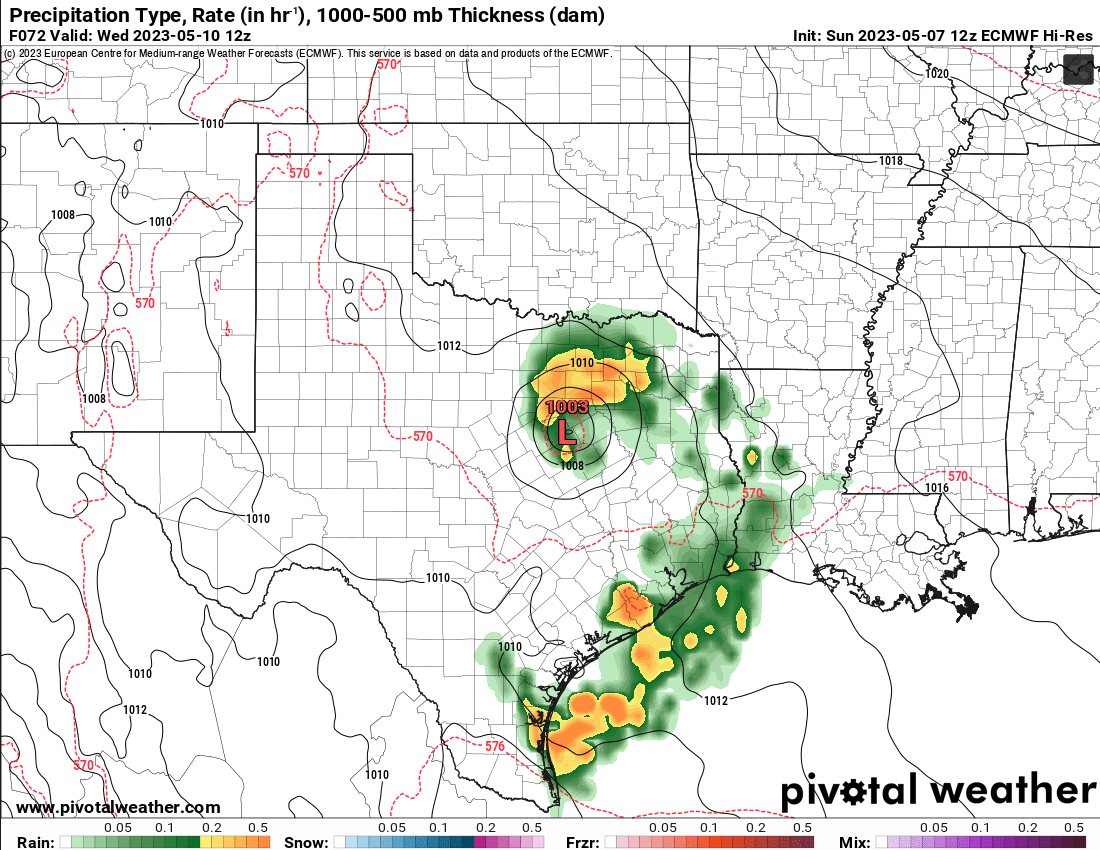 don wrote: Sun May 07, 2023 1:44 pm 12Z EURO showing the surface low taking shape on Tuesday.Then moving into north Texas and becoming a tropical like low with a feeder band draped over the area.Screenshot 2023-05-07 at 13-17-19 Models ECMWF Hi-Res — Pivotal Weather.png.Screenshot 2023-05-07 at 13-16-55 Models ECMWF Hi-Res — Pivotal Weather.pngScreenshot 2023-05-07 at 13-17-42 Models ECMWF Hi-Res — Pivotal Weather.png