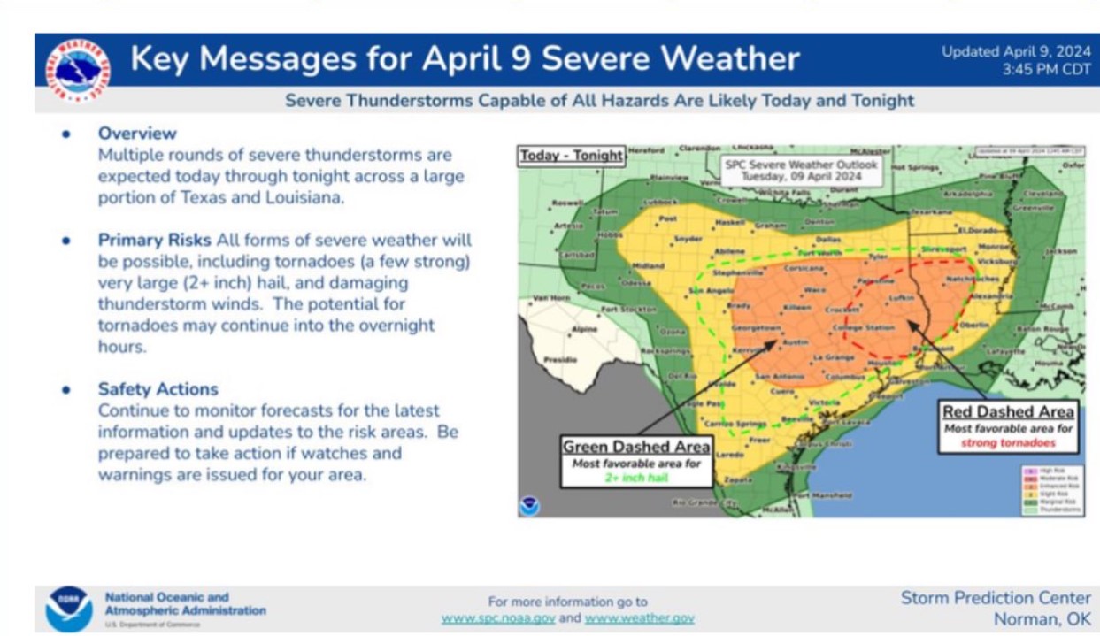Yes, the action isn’t going to really get going till early tomorrow morning for most of us. That has pretty much always been the case. Nothing today but a lot of yucky humidity and gusty annoying winds.Stratton20 wrote: ↑Tue Apr 09, 2024 11:59 am I bet most of the action will stay to the north like yesterday as the mesocales agree with this idea, im not overly concerned today, maybes tuesday morning could be the time to watch, but overall today should be quiet here locally, central and north texas are a different story though