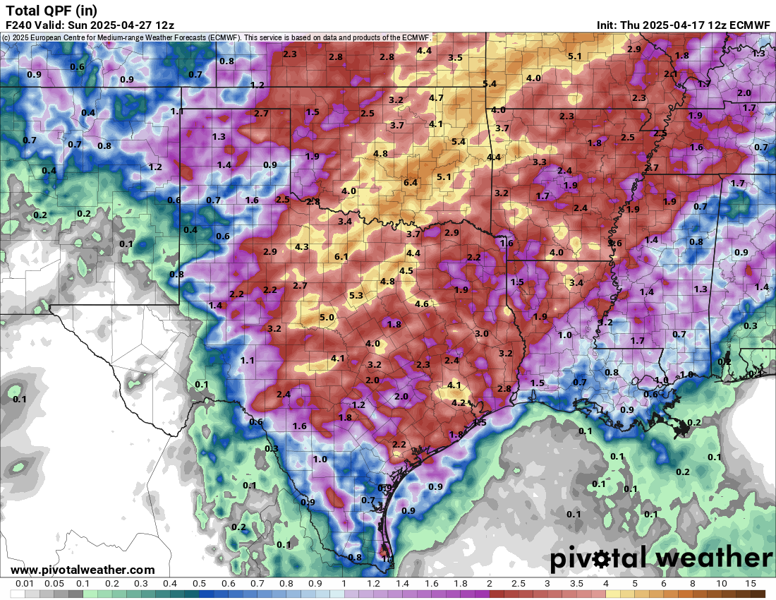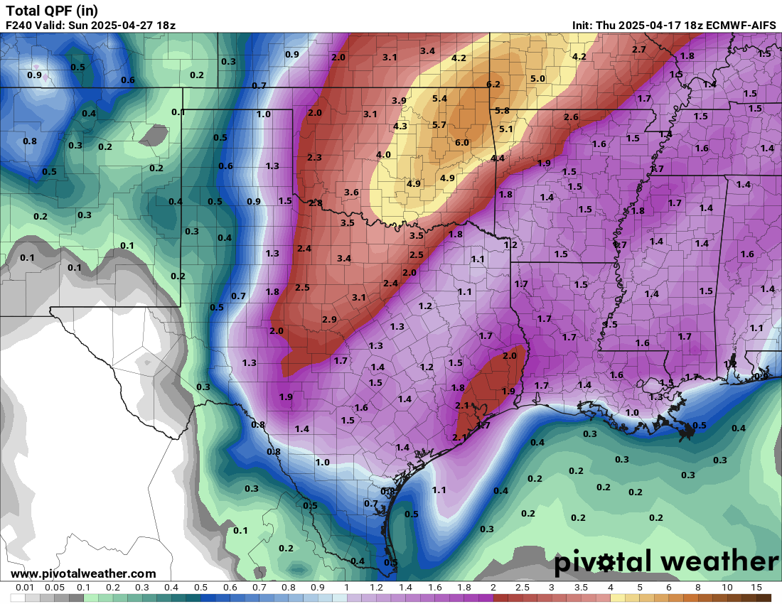 What timeframe is it showing 2-5" for? This weekend? Sunday - Thursday?Stratton20 wrote: ↑Thu Apr 17, 2025 2:18 pm Euro has 2-5 inches for se texas, Uncle Canadian agrees with the Euro, GFS as usual is too dry, its always late to the model party!