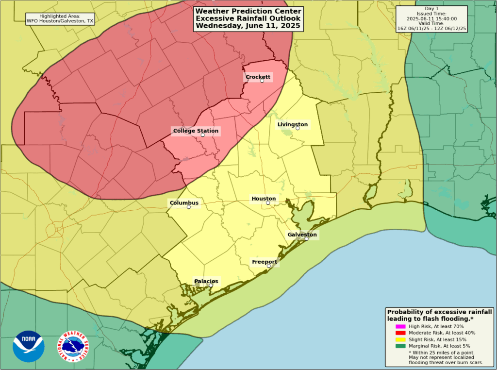 3. Moderate risk (level 3 out of 4) for flash flooding northwest of Houston metro today into tonight