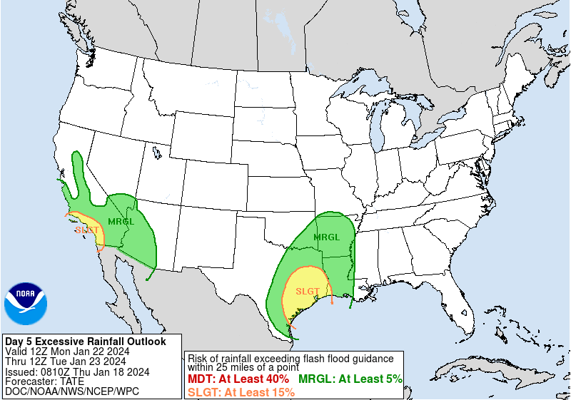point, a Slight Risk is delineated for Day 5/Monday in the