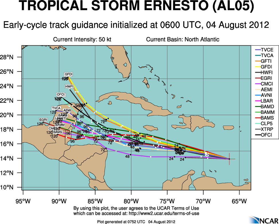 As the HPC mentions, some respect had to be given to the ensembles ~vs~ the operational guidance and that is why there still remains a lot of uncertainty exactly where Ernesto will travel beyond the Yucatan...