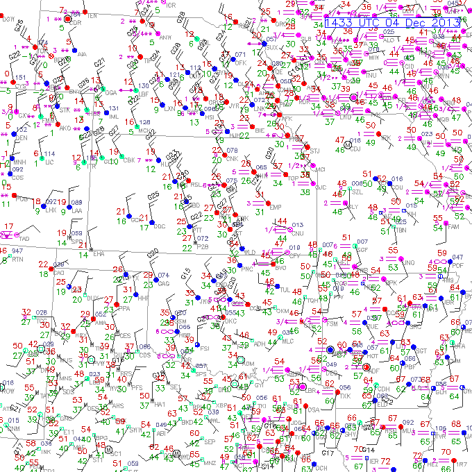 Here are the latest surface observations as of 14Z. Note the cold air has indeed arrived across the Plains extending W into Colorado and is pushing S through the Panhandles of Texas and Oklahoma. It is noteworthy via water vapor imagery that a series of upper air disturbances are dropping S as the ride up and over the EPO Ridge near the Aleutian Islands of Alaska. These disturbances will continue to drop S into Arizona and Northern Mexico before turning ENE and crossing Texas/Oklahoma/Arkansas and the Northern half of Louisiana. Also notice the sub tropical jet connection that is becoming increasingly noisy SW of Southern California into the Baja of Mexico's East Pacific Coast. That moisture will likely become embedded with each upper air disturbance as they drop S allowing for over running light drizzle/light rain to develop into the weekend.