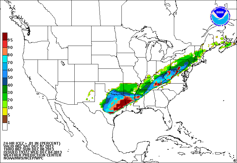 HPC/WPC Forecaster Kocin is at the forecast desk this afternoon and he has updated the icing potential and as we can see, the chances have increased for portions of Central and SE Texas.