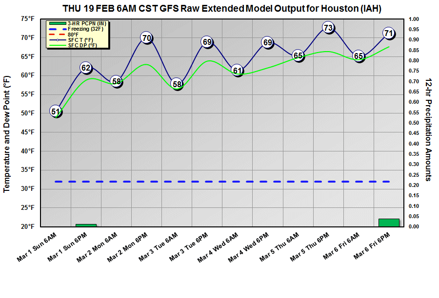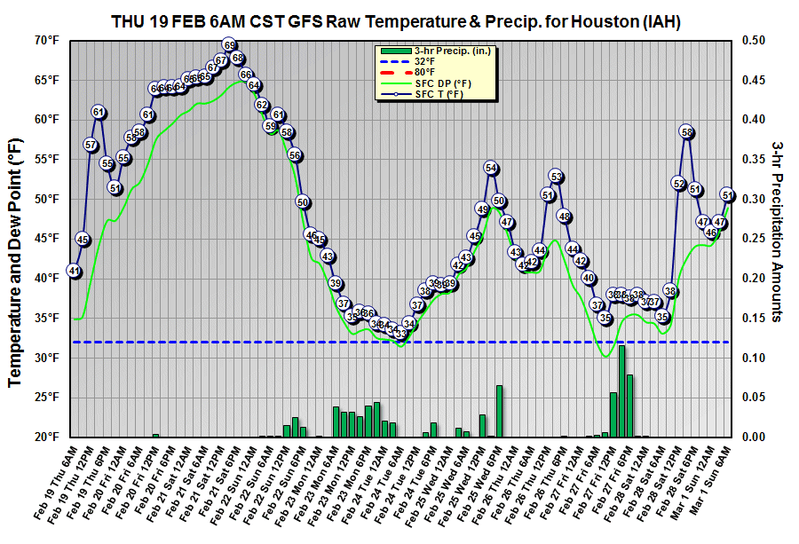 Here are a couple of meteograms for Houston (IAH). I wouldn't count on anything more than cold rain Monday, probably with some sleet mixed in. Similar to the last event. If we can make it through next week the long-range GFS is indicating some nice March warmth.