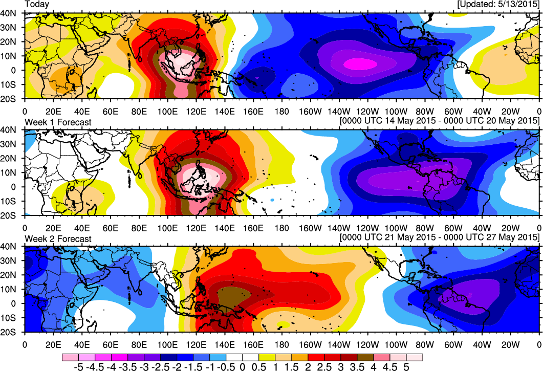 A quick update regarding the expected forecast for the remainder of this week into early next week. No real change is expected in the general synoptic pattern of a Western upper trough with embedded disturbances rotating beneath that trough as well as deep tropical moisture streaming off the Pacific Ocean and the Gulf of Mexico from the NW Caribbean Sea. Another wrinkle in the forecasting challenges is a very wet phase of the Madden Julian Oscillation (MJO) is steadily advancing East across the Pacific and will be in our Regional 'backyard' next week. The blue shading indicates a great deal of instability or is conducive for tropical showers and convection to develop while the red shades indicate a downward motion in the mid/upper level winds, meaning less thunderstorm development. All that said we see no change in the very unsettled pattern across Texas and Oklahoma with additional chances of very heavy rainfall almost daily into next week.