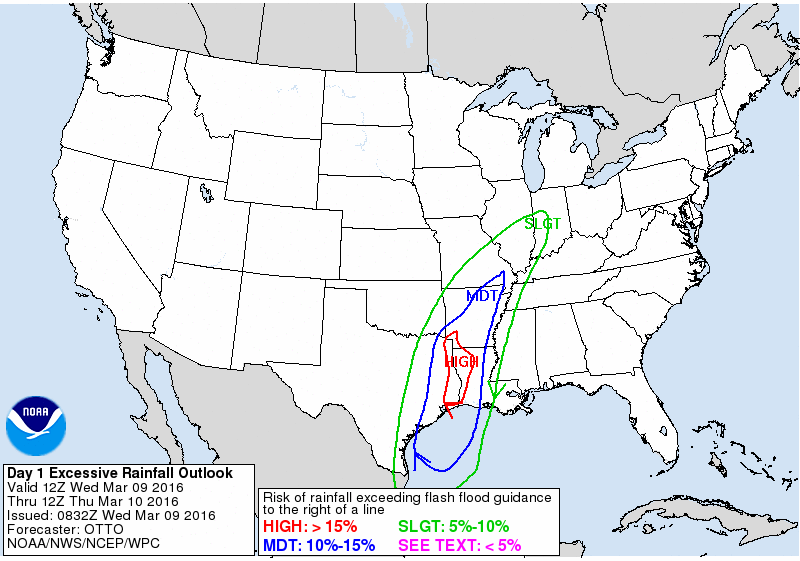 The Weather Prediction Center continues with a Moderate Risk for Excessive Rainfall. Increases to High Risk for East Texas/Western Louisiana.