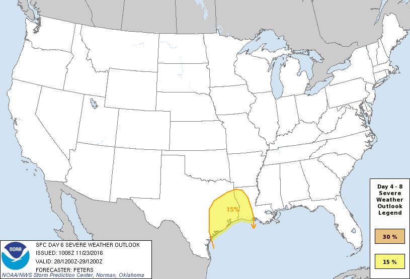 Good to get some storms across the area this morning. The progressive pattern continues to develop as we transition to an active weather regime. Folks need to watch next Monday into Tuesday rather carefully as a deeper trough digs to our West and potent storm system organizes with the potential of severe storms a possibility. The Storm Prediction Center has outlined Eastern Texas and portions of Western Louisiana in their Day 6 Outlook. Meanwhile, Happy Thanksgiving to all!