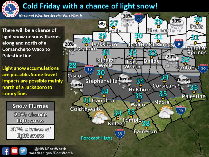 Will go with light rain on Friday and Friday evening south of HWY 105 and a light rain/sleet mixture north of HWY 105…could probably add light freezing rain from College Station to Lake Livingston, but not confident enough yet that the surface temperature will reach freezing before the rain ends. I am a little worried that the models may not be handling the cold air correctly since they have been trending colder with each run and this could put some of those northern areas near the critical freezing threshold earlier on Friday. For now not expecting any impacts from any freezing/frozen precipitation if any actually occurs.