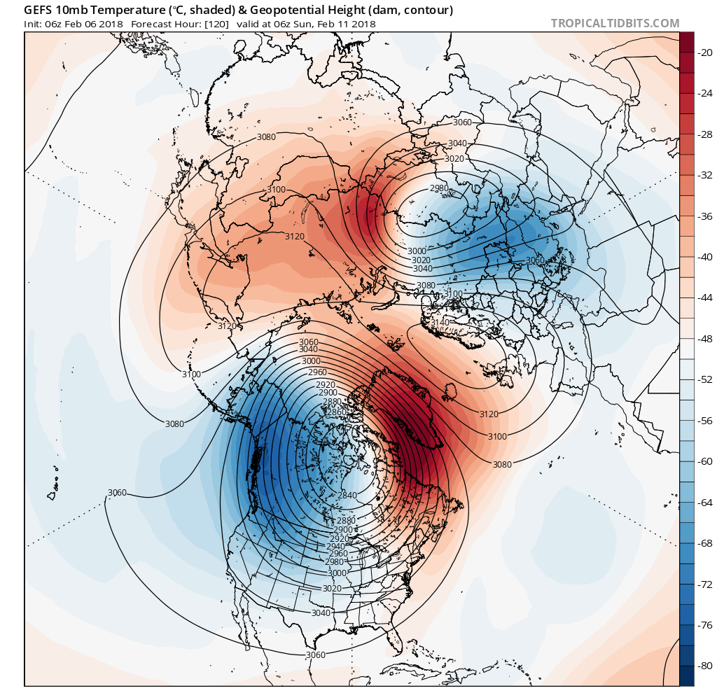 We need to monitor the weekend sensible weather forecast very carefully. The Global models are still resolving that Polar Vortex Split and the Sudden Stratospheric Warming Event that will be under way this weekend. Very cold air lurks across the Central and Southern Plains where temperatures are in the single digits to lower teens this morning. Tomorrow and Thursday is probably going to feel rather chilly with temperatures struggling to get to the lower 50's at best. The next spoke (Arctic Front) dropping S out of Canada is rather frigid with another spoke (Arctic Front) arriving Sunday. That Hudson Bay Polar Vortex continues to spin and pull down very chilly air from Canada into the Plains. The images below show the Upper Air (500mb) pattern with a NW flow and a cross Polar flow into the Day 8+ period. The other image is the SSW (Sudden Stratospheric Warming) Event underway. Those events are not uncommon, but do not happen very often. The last SSW events was in 2012 and another in 2009. We are still try to understand the full implications of these events that pull extremely cold air from the Troposphere down to the surface, although moderated. Some of the best Forecasting minds are advising caution when attempting to accurately forecast what the long range forecast may bring regarding our sensible weather, so take that into consideration.