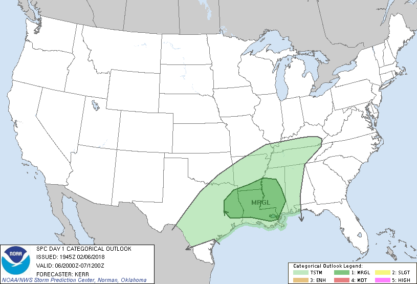 guidance of tonight into tomorrow suggest the risk of thunderstorms capable of producing very small hail has increased a bit closer to Houston and extends East to near New Orleans, The cold frontal boundary is nearing the Hill Country and should continue to push S overnight. A glance at the last 12Z guidance suggest we may need to trim back expected high temperatures a bit tomorrow. It likely we will not escape the 40's. It's currently in the mid 70's behind the warm front here in NW Harris County. Tomorrow will feel raw compared to today.