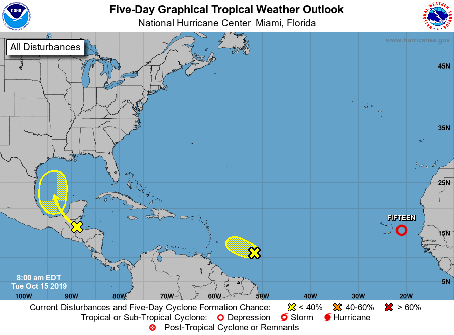 An area of weak surface low pressure over central America will move into the Bay of Campeche of Wednesday.