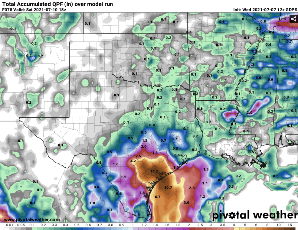 0z GFS has shifted the heaviest axis of moisture further northeast. Offshore and along the middle and upper Texas coastal counties.